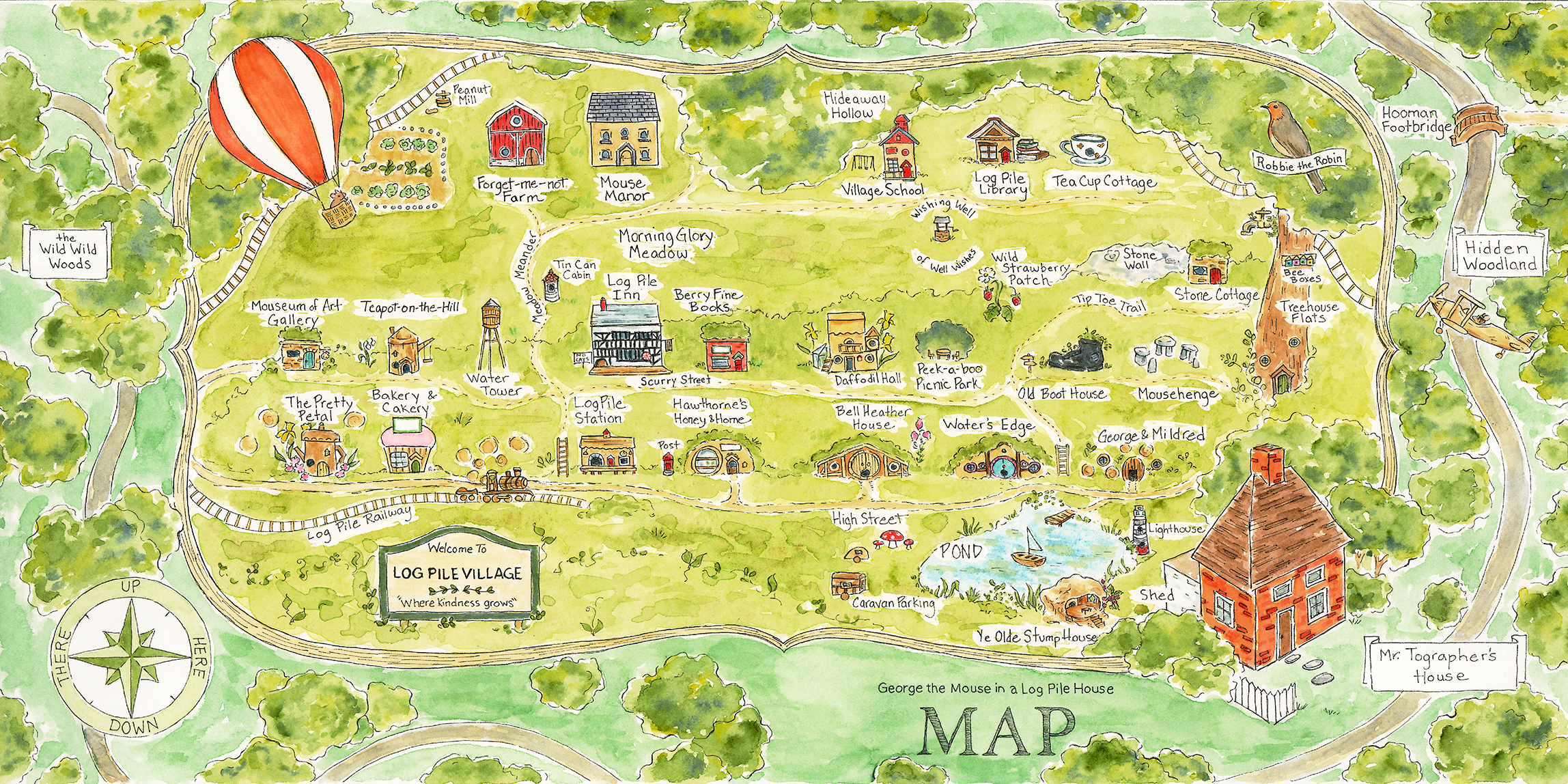 Explore George’s world and see where your favorite friends from George the Mouse frolic and play! Peek into the Villаge School, the Bakery and Cakery, or Forget-me-not Farm.